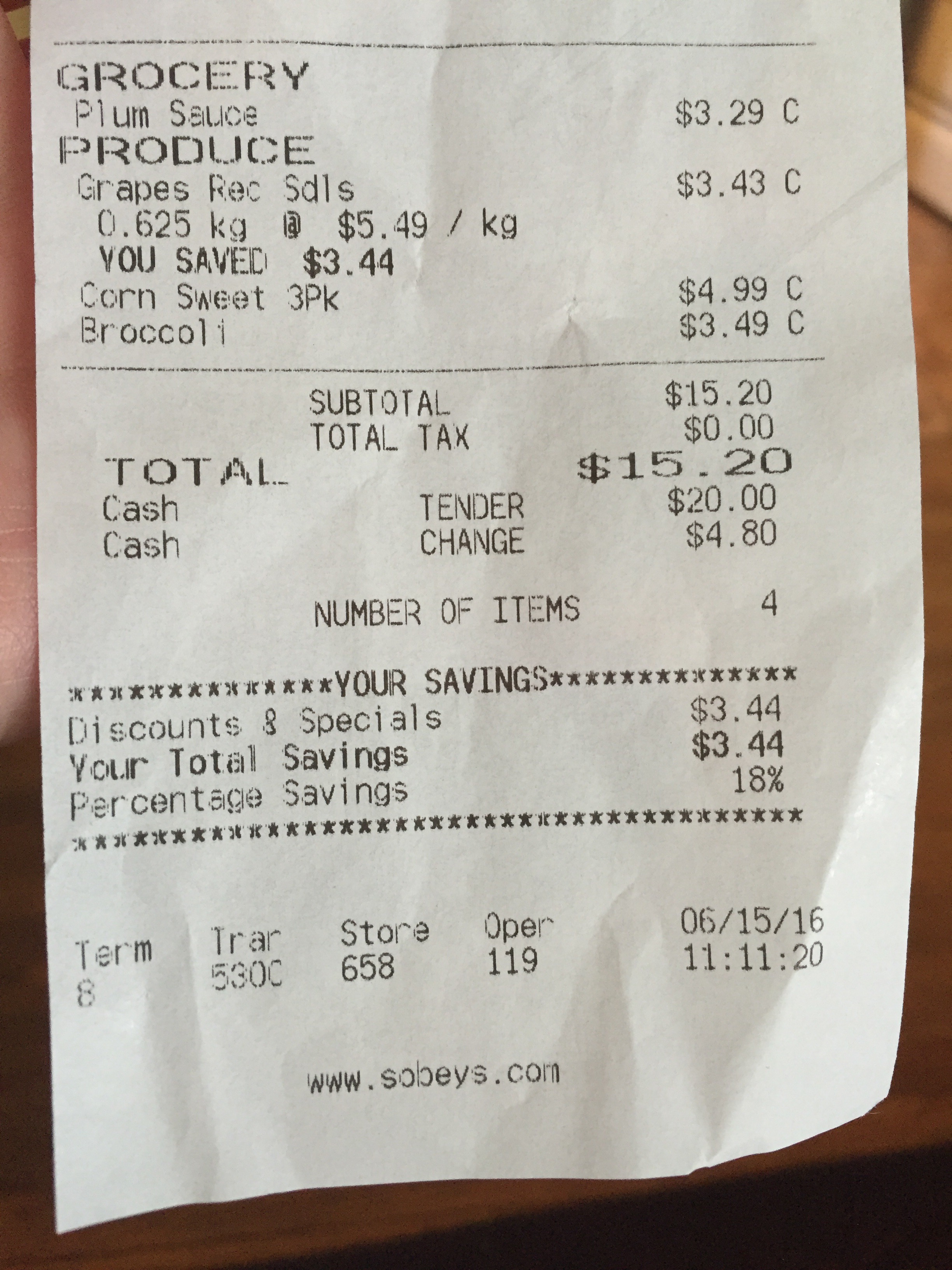 Receipt #2 – plum sauce, grapes, corn and broccoli for $15.20. Now did you notice the savings on the grapes? Grapes are crazy expensive and they’re rarely on sale. So let’s add on my savings and take away the plum sauce. So my produce now costs $15.35. Again, not much you can do with those three ingredients on their own. You could make a snack out of the grapes I guess! For $15.35 I can take my entire family to McDonald’s and buy two children’s happy meals (burger/nuggets, fries/apples, yogurt and a toy), two hamburgers, two small fries and two small drinks for Hubby and I. Feed an entire family vs 3 ingredients. Scary, right?