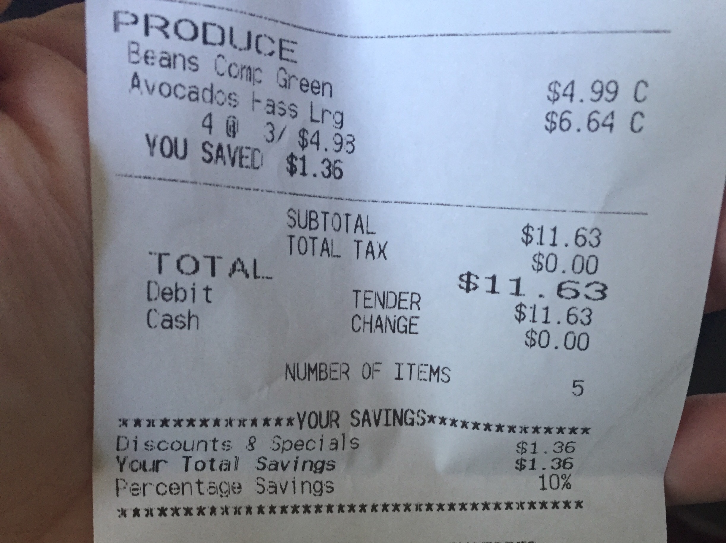 So for receipt #1 – a small bag of green beans and four avocados came to $11.63. Individually, there’s not much you can do with these items (except make baby food!). For that price, I could go to McDonald’s and buy a Double Quarter Pounder meal deal (burger, fries and a drink) and leave the restaurant with change in my pocket. Two ingredients vs an entire meal. Think about that for a minute.
